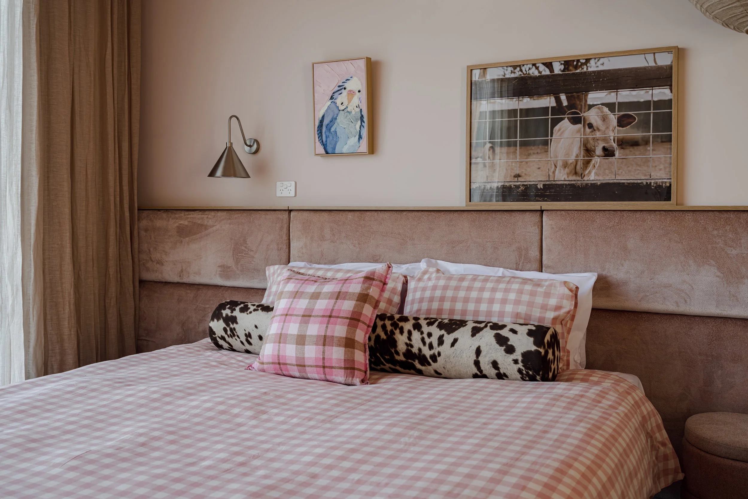 Playful custom upholstery and bespoke bedheads add softness and personality, with brown cowprint velvet featured across bolster cushions and reupholstered dining chairs — an unexpected detail that brings character and warmth to each stay.