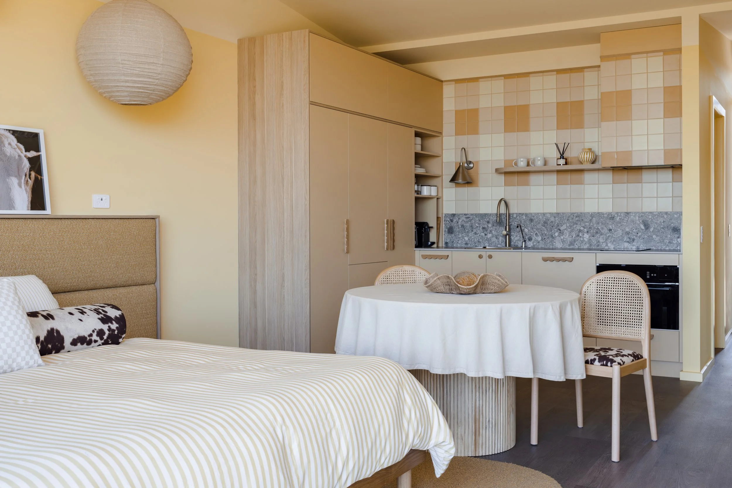 Cabins Four and Five continue the immersive, colour-led experience of the Hahndorf Farm Barn studios — intimate retreats designed to feel expressive, warm and deeply considered. Each studio operates independently while also interconnecting, allowing couples, friends or families to share adjoining spaces with ease.