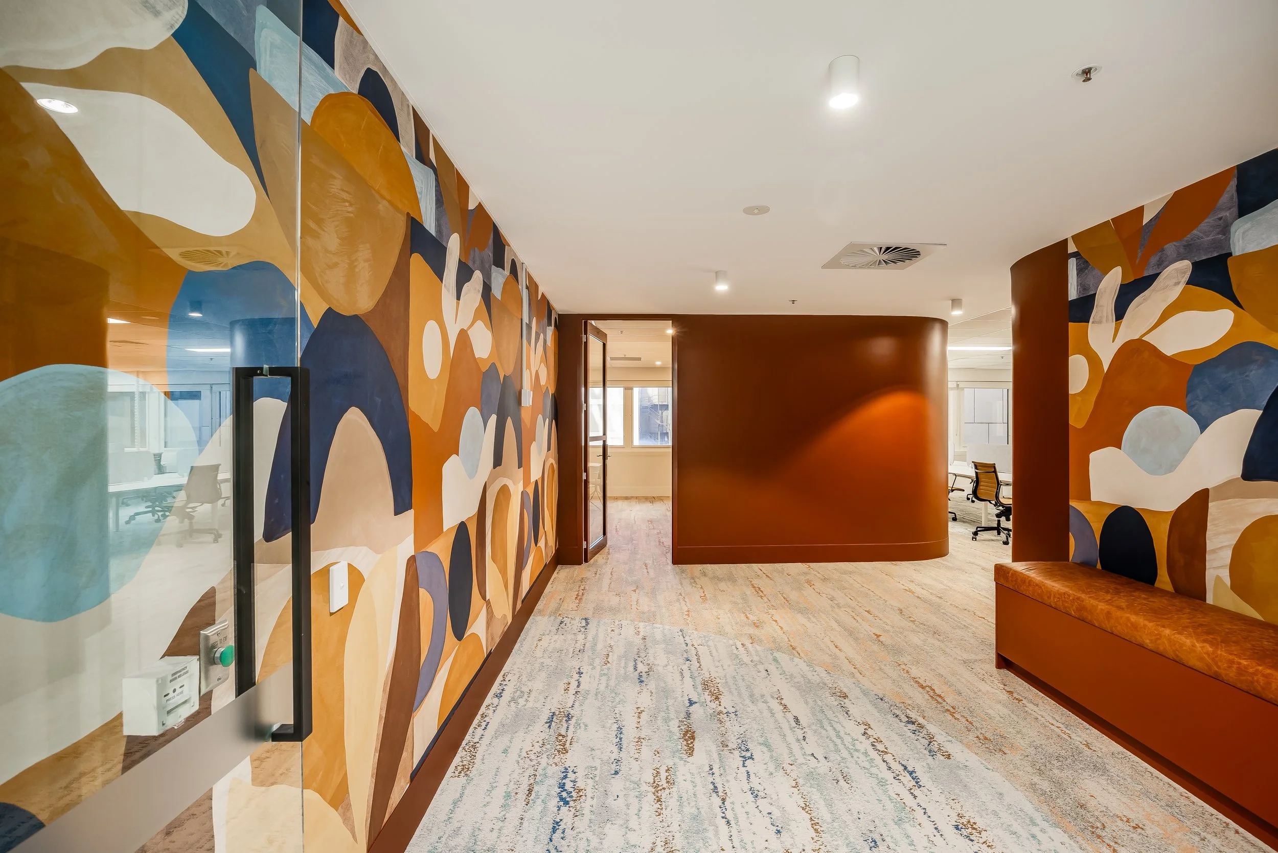 Located at 19 Grenfell Street, this spec suite embraces colour with confidence. Anchored by a bold feature wallpaper, the design introduces soft curves and a rich palette of deep reds, warm oranges and layered blues — setting the tone for a workplace that feels energetic and inviting.